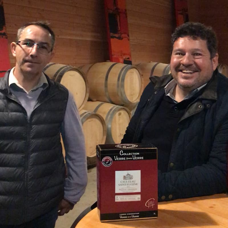 Jean Paul LAFAGE propriétaire de la marque Collection Verre après Verre® interview Christophe RAMBAUD (maître de chai du Château Saint- Eugène) appellation Pessac Léognan, lors d'une mise en Bag in Box.