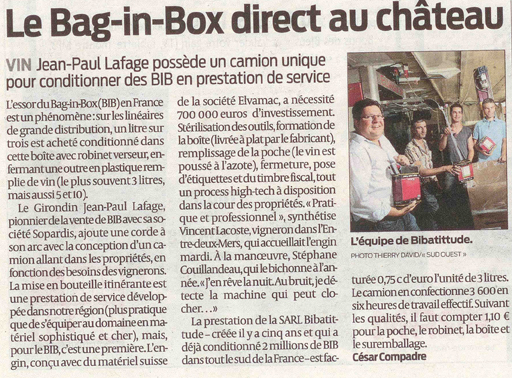 En 2009, Jean-Paul Lafage crée BIBATTITUDE, la première unité mobile entièrement automatisée de mise en bag-in-box.